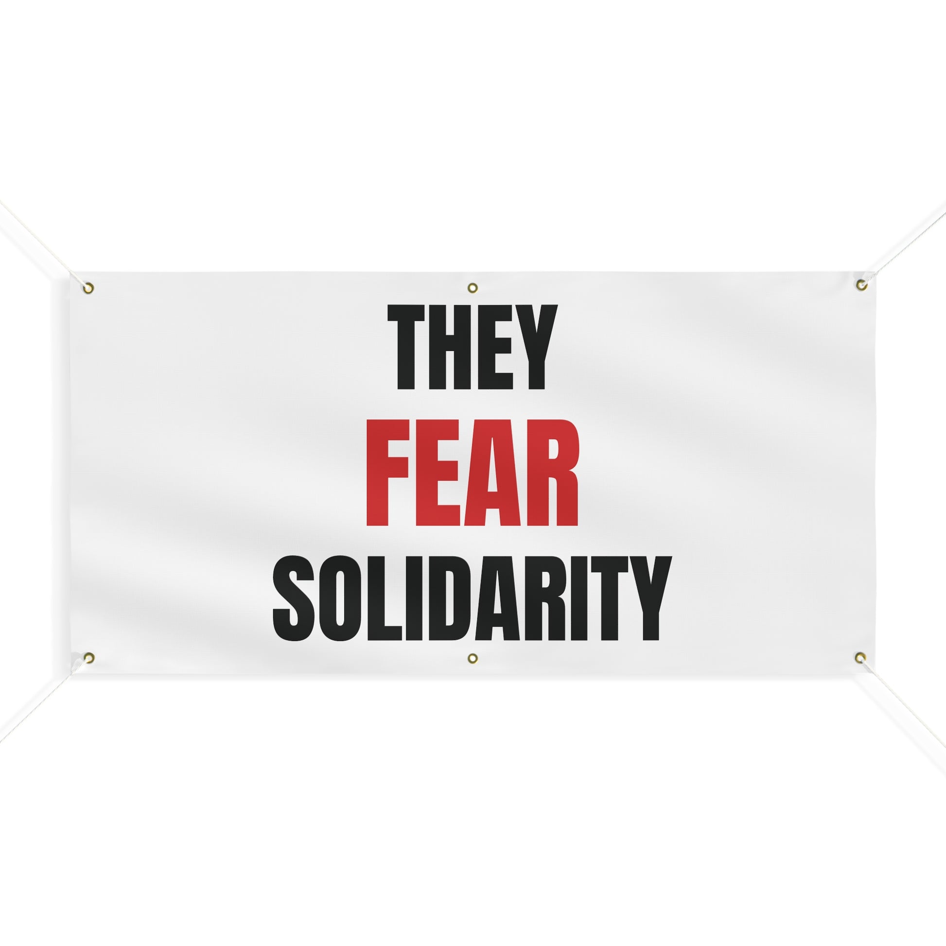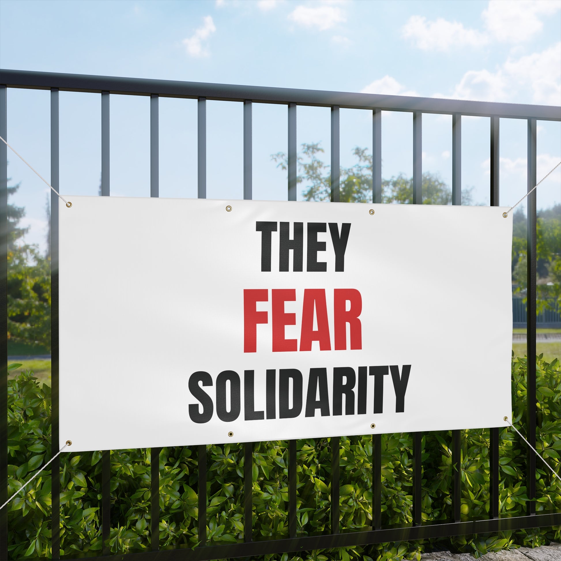 Make your message unmissable. This bold matte banner featuring THEY FEAR SOLIDARITY in crisp, high-impact print is built for rallies, protests, community events, and anyone ready to stand up and be seen. Its durable, water-resistant vinyl construction means it holds up outdoors, while the smooth matte finish reduces glare and boosts visibility. Trimmed edges give it a clean look, whether hanging on fences, walls, or carried in a march. Available in multiple sizes.